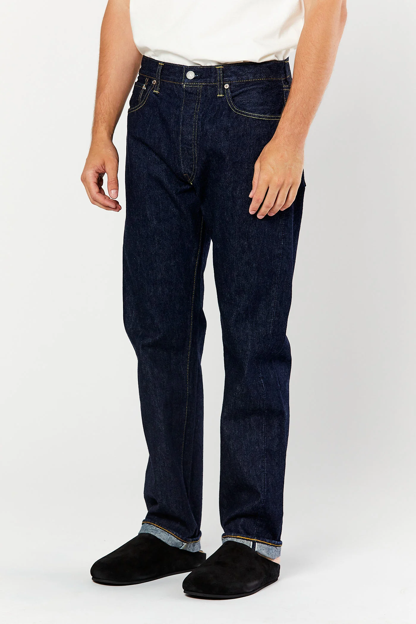 Japanese selvedge denim. Straight leg fit. Medium rise. Vintage style paper waist patch. Oxidized rivets. Button fly.